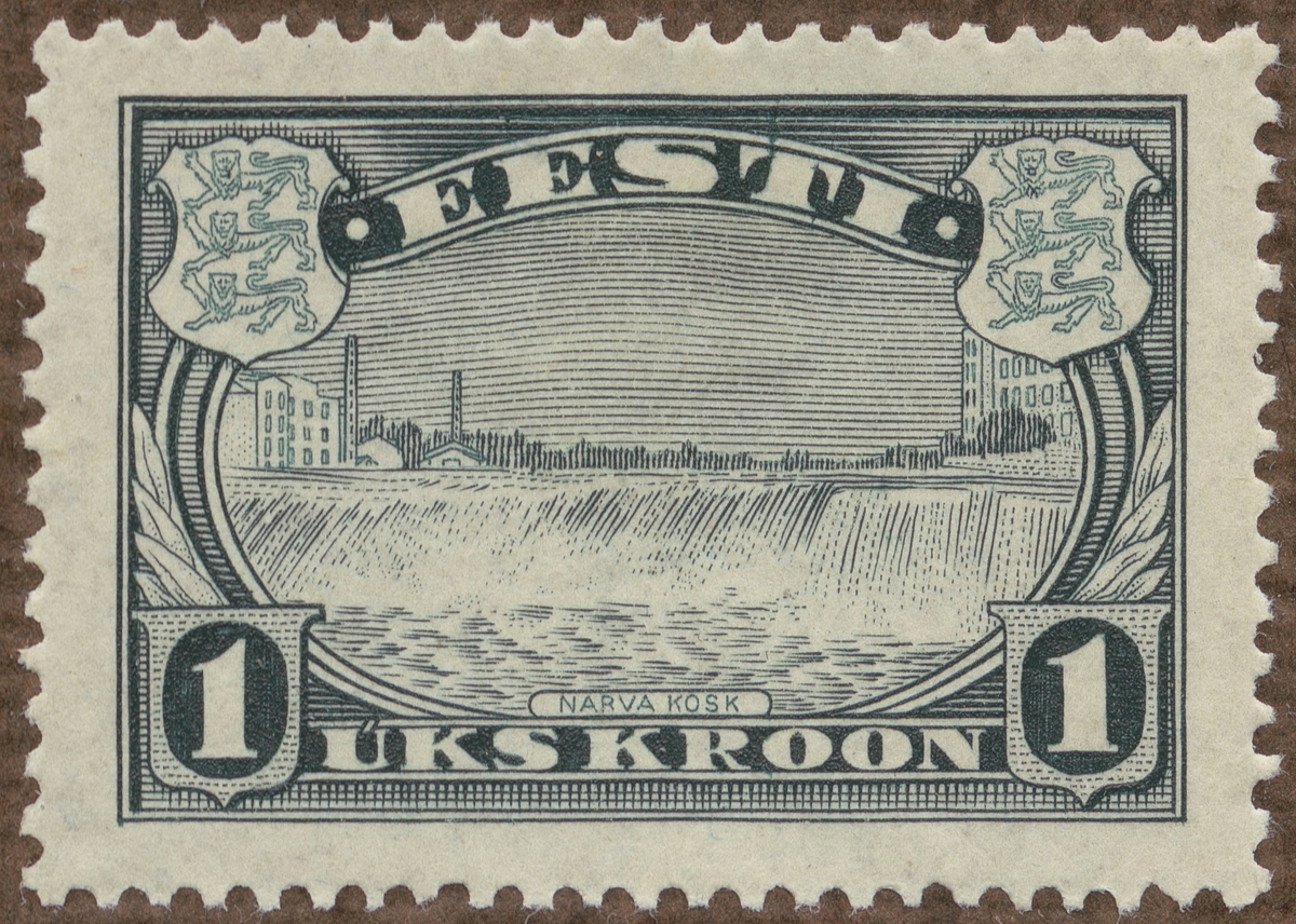 Frimärke ur Gösta Bodmans filatelistiska motivsamling, påbörjad 1950. Frimärke från Estland, 1933. Motiv av Vattenfallet vid Narva