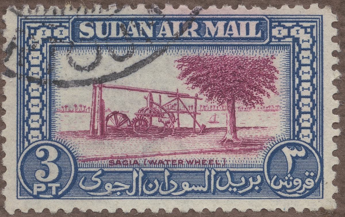 Frimärke ur Gösta Bodmans filatelistiska motivsamling, påbörjad 1950. Frimärke från Sudan 1955. Motiv av S.k. "Sagia" eller vattenhjul i Sudan