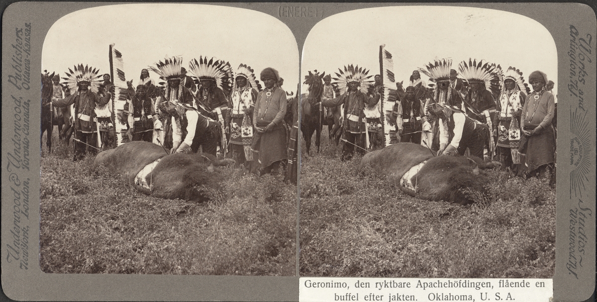 Stereobild av Geronimo, den ryktbare Apachehövdingen, flående en buffel efter jakt.