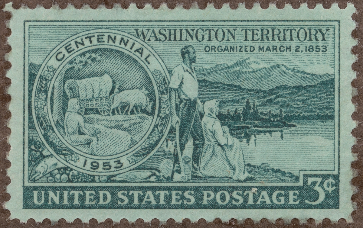 Frimärke ur Gösta Bodmans filatelistiska motivsamling, påbörjad 1950. Frimärke från U.S.A., 1953. Motiv av Oxvagn Landskap "Washington territoriet organiserat den 2 mars 1853 100-årsminne"
