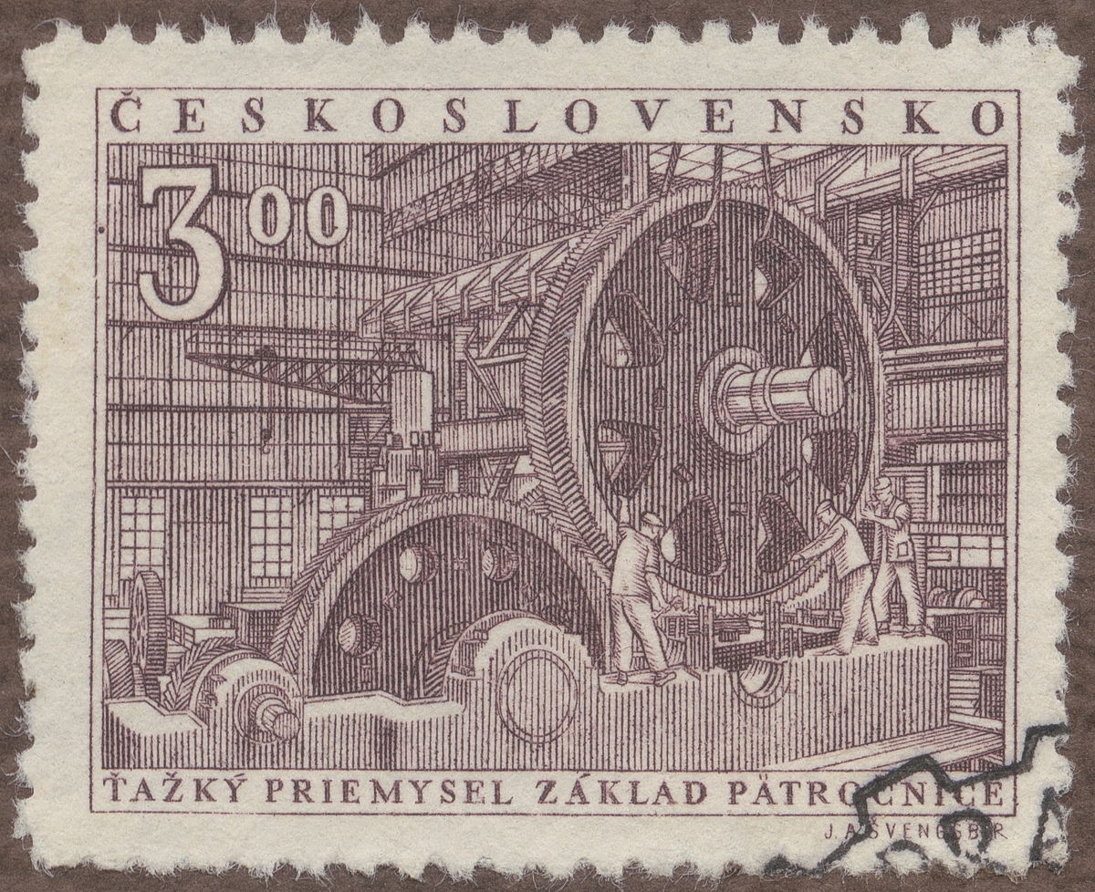 Frimärke ur Gösta Bodmans filatelistiska motivsamling, påbörjad 1950. Frimärke från Tscheckoslovakiet, 1951. Motiv av Montering av turbinhjul