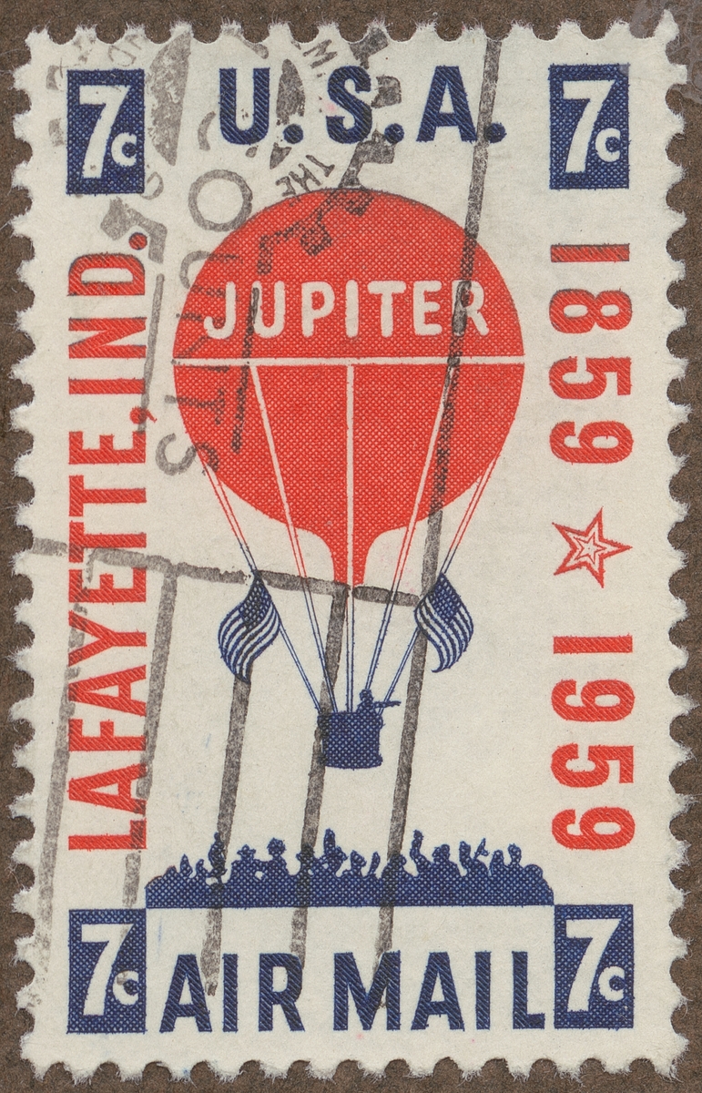 Frimärke från U.S.A. 1959. Motiv av Luftballongen "Jupiter" "100-årsminne av postflygaren Johan Wises flygning av ballongen Jupiter: Lafayette-Crawfordsville, Indiana d. 17 augusti 1859.