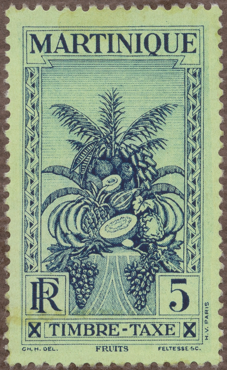 Frimärke från Martinique, 1933. Motiv av diverse exotiska frukter.