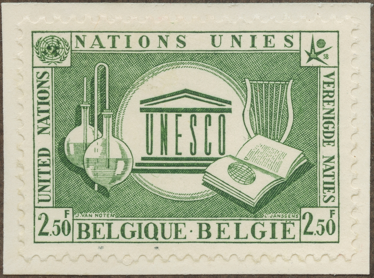 Frimärke från F.N., 1958. Motiv av Symbol UNESCO-Symboler Kemi Litteratur Musik Bryssel Utställn.
