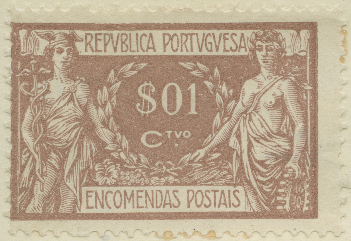 Frimärke ur Gösta Bodmans filatelistiska motivsamling, påbörjad 1950. Frimärke från Portugal, 1920. Motiv av "Symboler Handel och Industri"