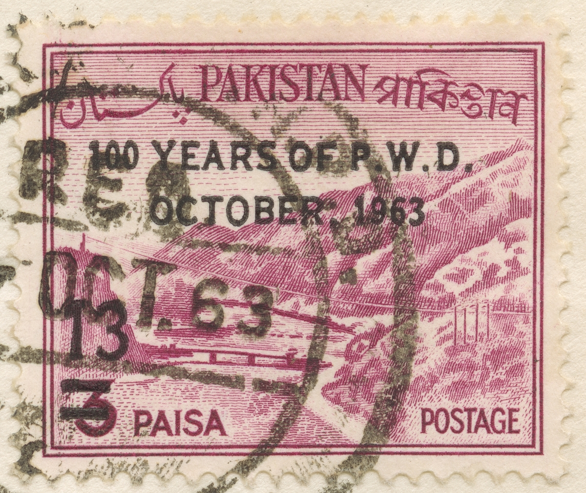 Frimärke från Pakistan, 1961. Motiv av Khyber passet och bro. Överstämpling, svart "100 YEARS OF P.W.D. OKTOBER 1963" Pakistan Public Works Departement "Förstadagsbrev"