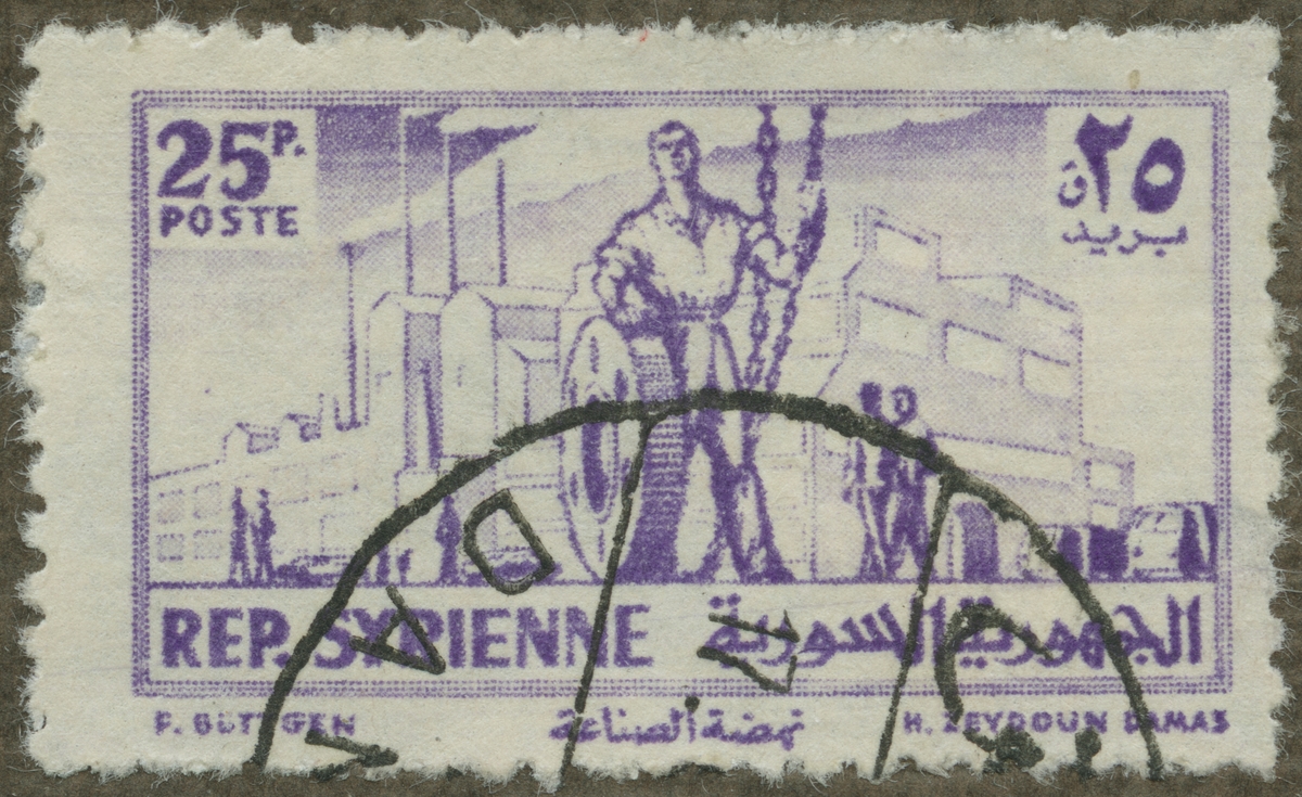 Frimärke ur Gösta Bodmans filatelistiska motivsamling, påbörjad 1950. Frimärke från Syrien, 1956. Motiv av Industri-symbol" - Arbetare framför fabriksbyggnader - "