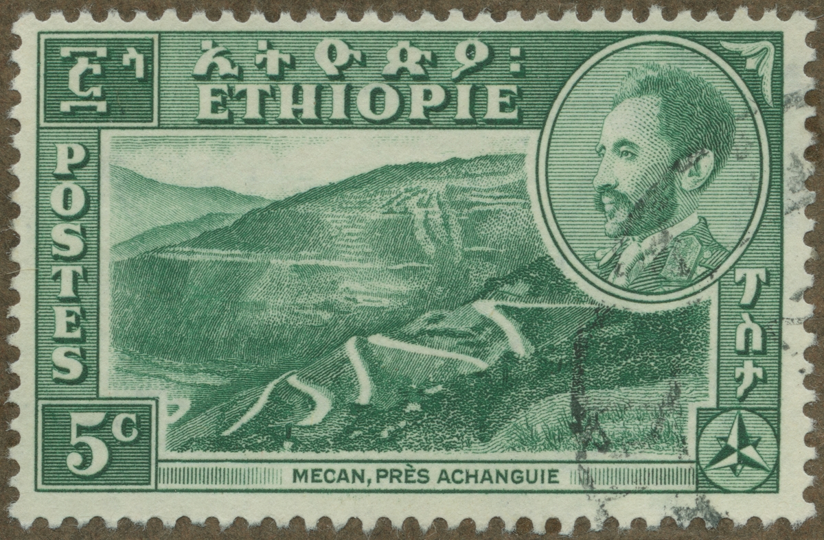 Frimärke från Etiopien, 1947. Motiv av Väganläggningar i Mécan Etiopien