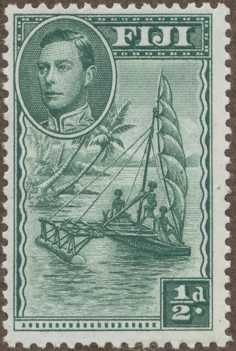 Frimärke från Fijiöarna, 1938. Motiv av palmer och Kung George VI.