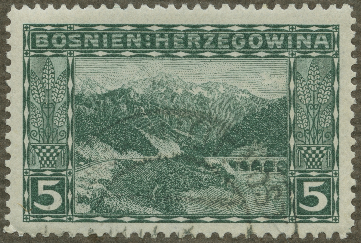 Frimärke från Bosnien, 1906. Motiv av Bro vid Nereiva Bosnien