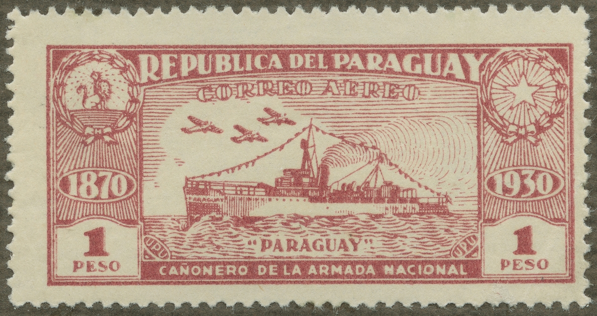 Frimärke från Paraguay, 1931. Motiv av Kanonbåten "Paraguay" i möte med trenne flygplan 60-årsminne av konstitutionen
