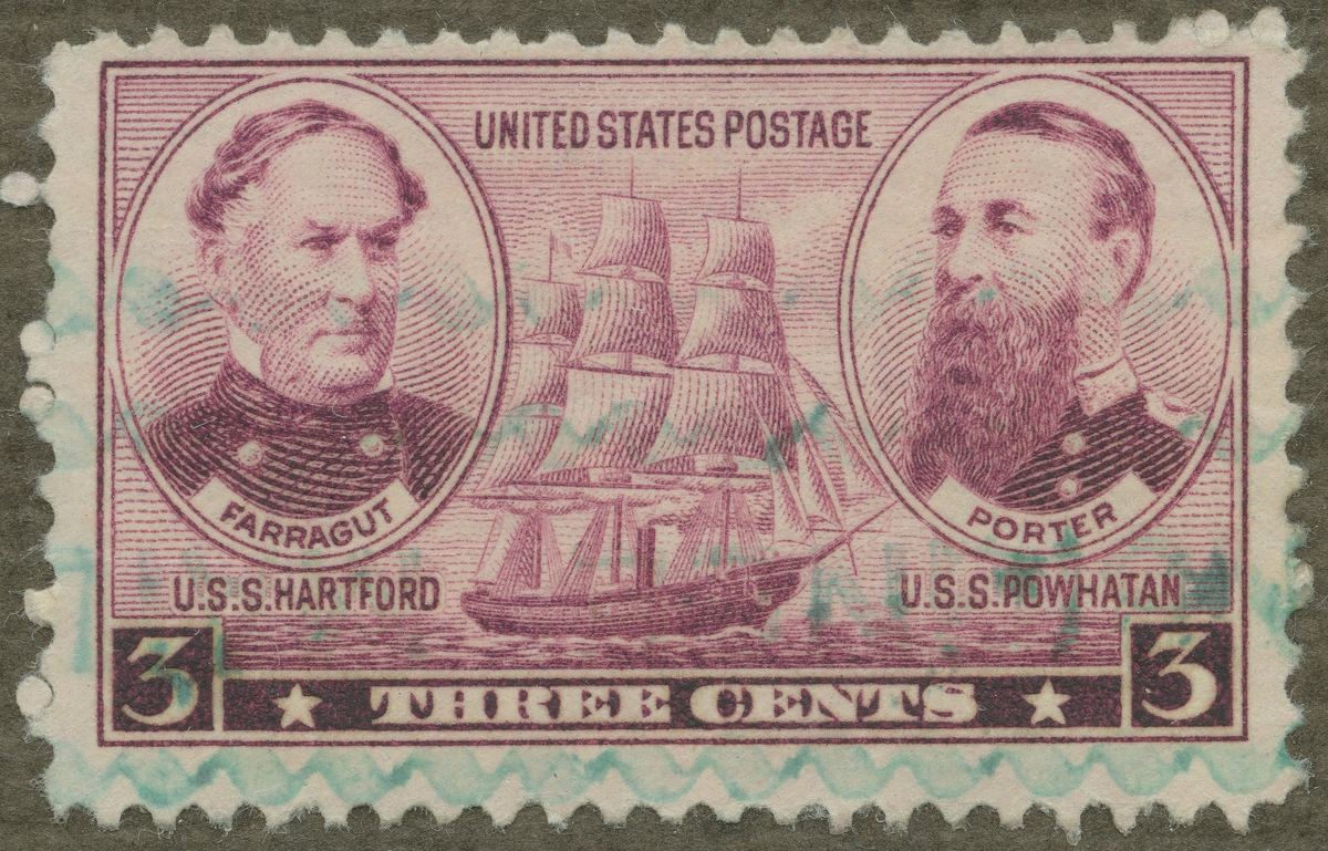 Frimärke från U.S.A., 1936. Motiv av Krigsfartyg: tremastare under segel med hjälpångmaskin: 1860-talet. (t.v.): Amiral Farragut (Kommandör U.S.S. Hartford) (t.h.): Amiral Porter (Kommandör U.S.S. Powhatan) "Serie: Armén och Marinen."