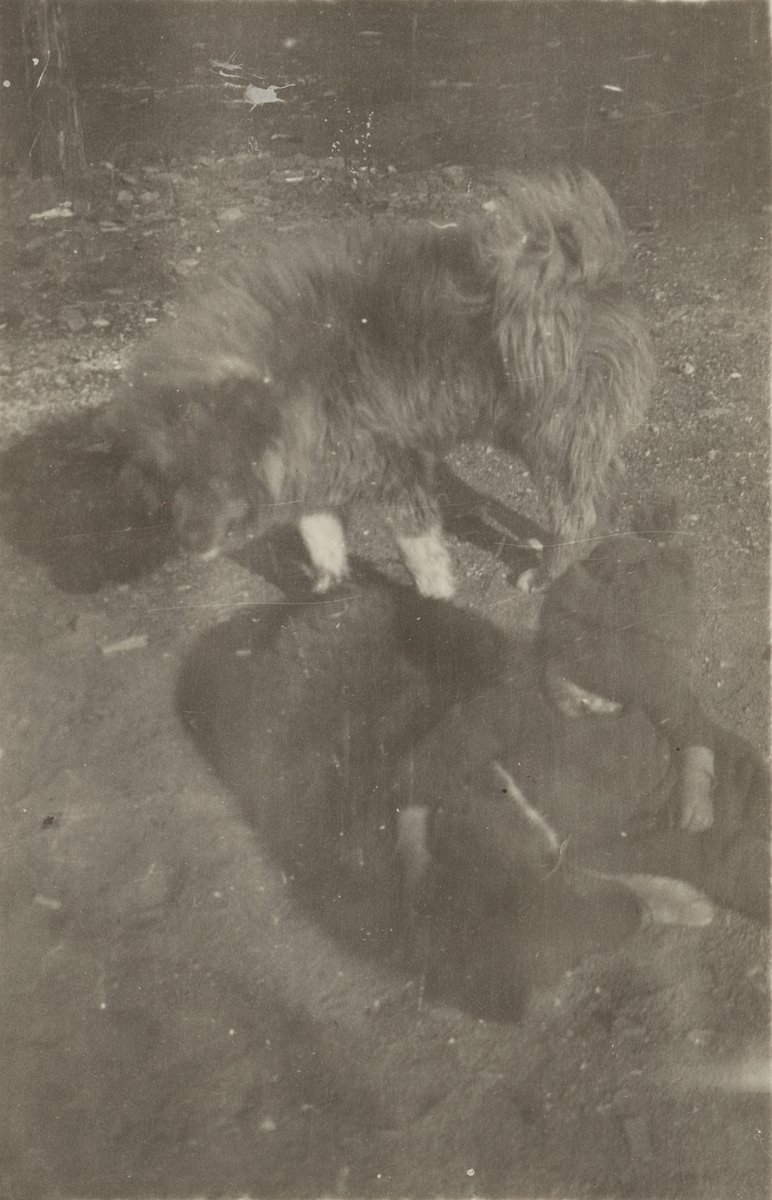 Fotografi från expedition till Spetsbergen. Motiv av barn som sitter på marken tillsammans med en hund.