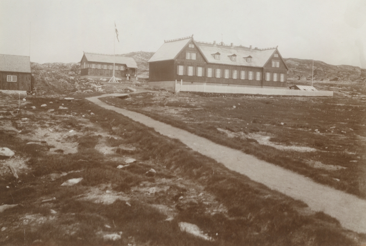 Fotografi från expedition till Grönland. Motiv av ett par större hus i ett bergslandskap. Bredvid husen står en falggstång med flagga i toppen. Det går en väg upp till husen.