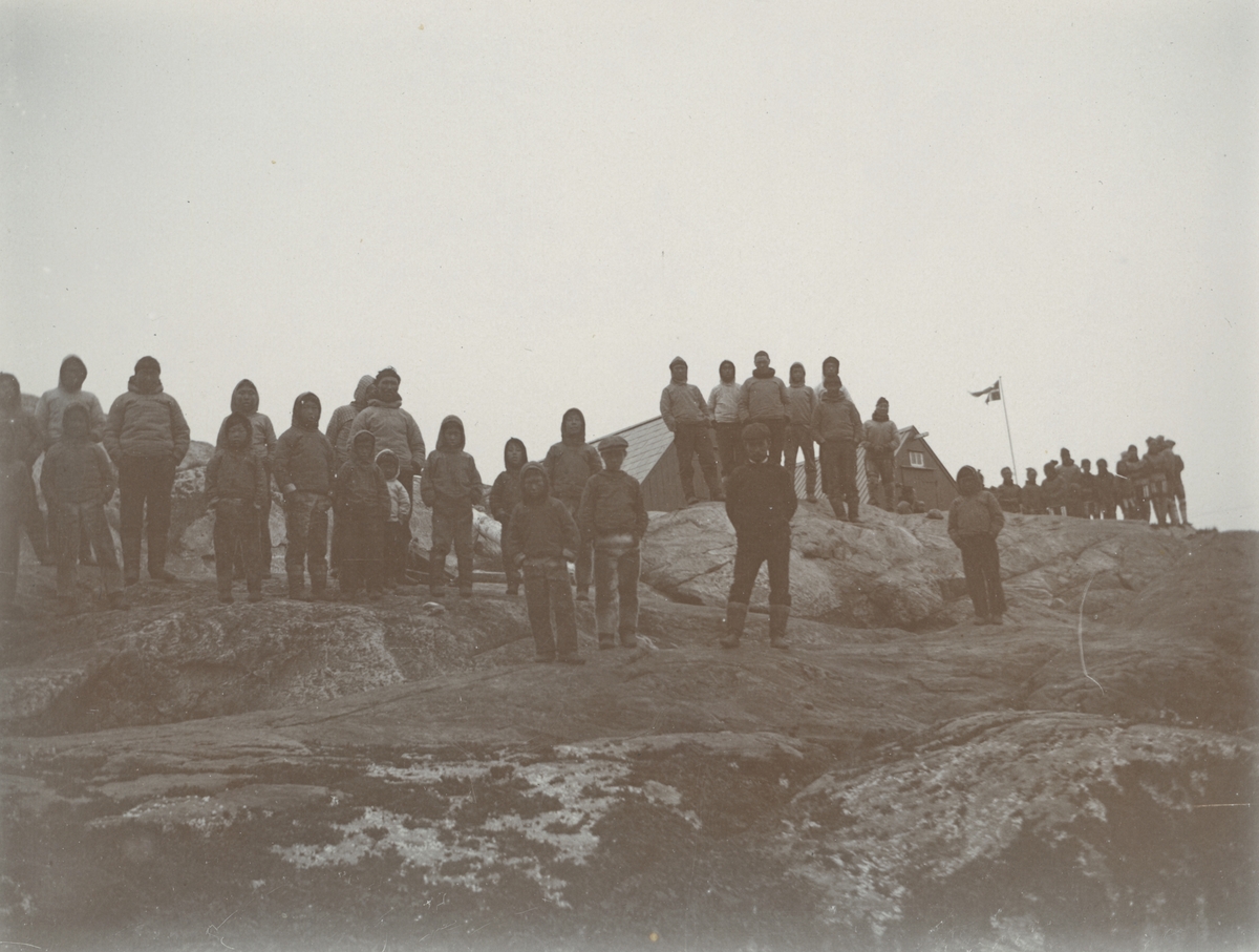 Fotografi från expedition till Grönland. Motiv av en stor grupp människor, både barn och vuxna, som poserar på en bergsklippa. I bakgrunden syns ett par hus och en flagga.