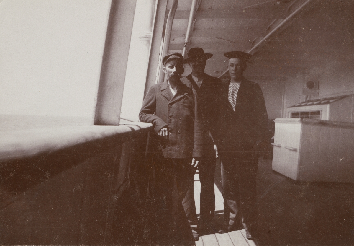 Fotografi från första svenska Antarktisexpeditionen 1901-1904. Motiv av tre män ombord på fartyg.