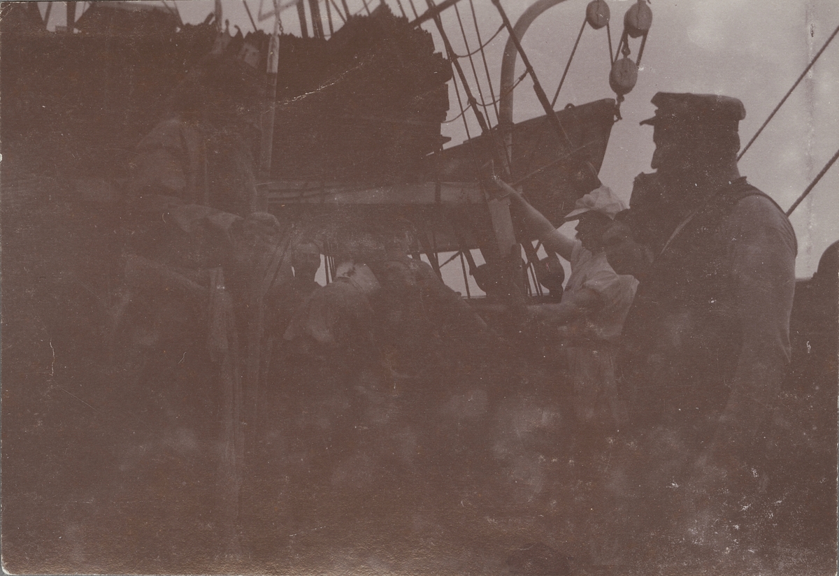Fotografi från första svenska Antarktisexpeditionen 1901-1904. Motiv av ett antal män ombord på ett fartyg.