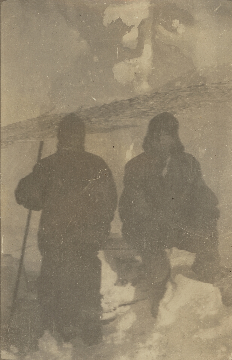 Fotografi från expedition till Spetsbergen. Motiv av två män som poserar i ett snölandskap. En av männen har en vandringsstav.