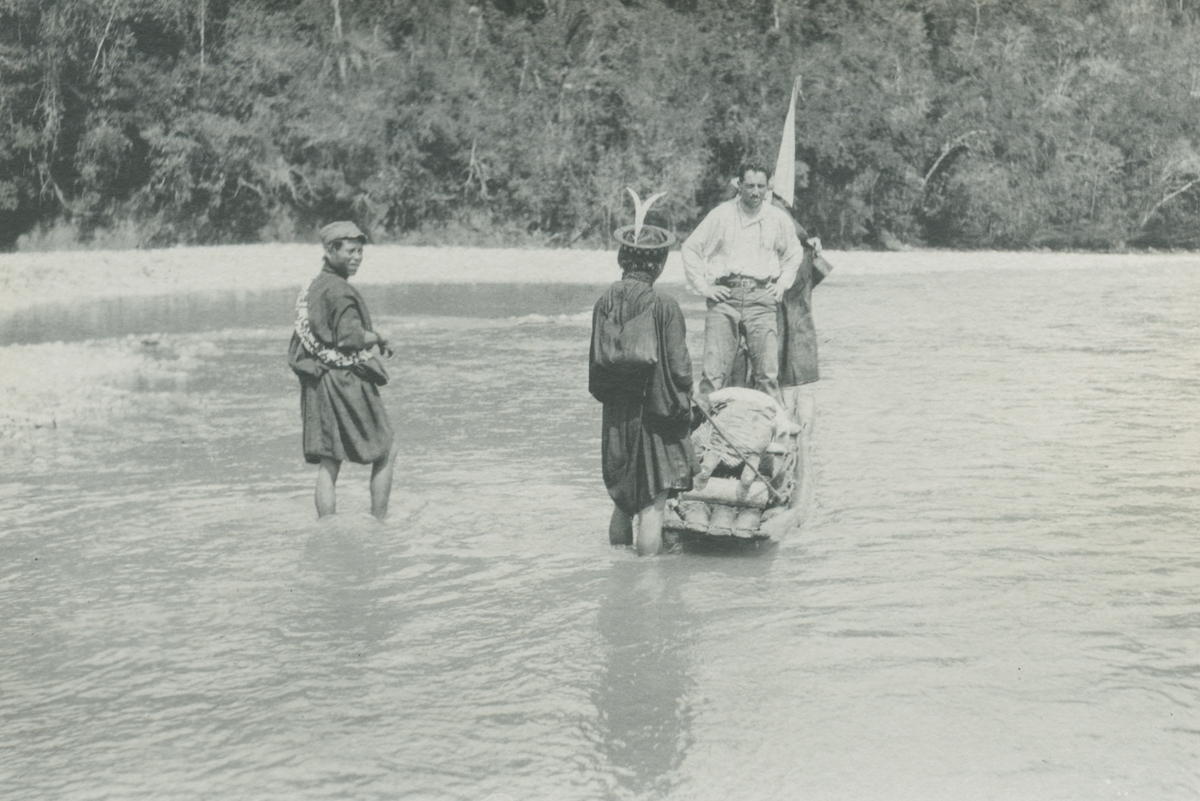 Fotografi från expedition till Peru 1920. Motiv av expeditionsdeltagare som får hjälp av två personer att ta sig över flod i djungeln.