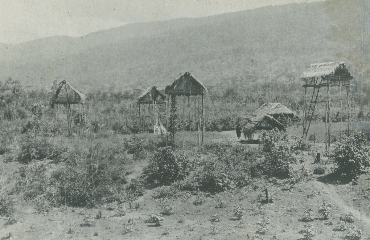 Fotografi från expedition till Peru 1920. Motiv av ett antal trähyddor med halmtak i djungeln.