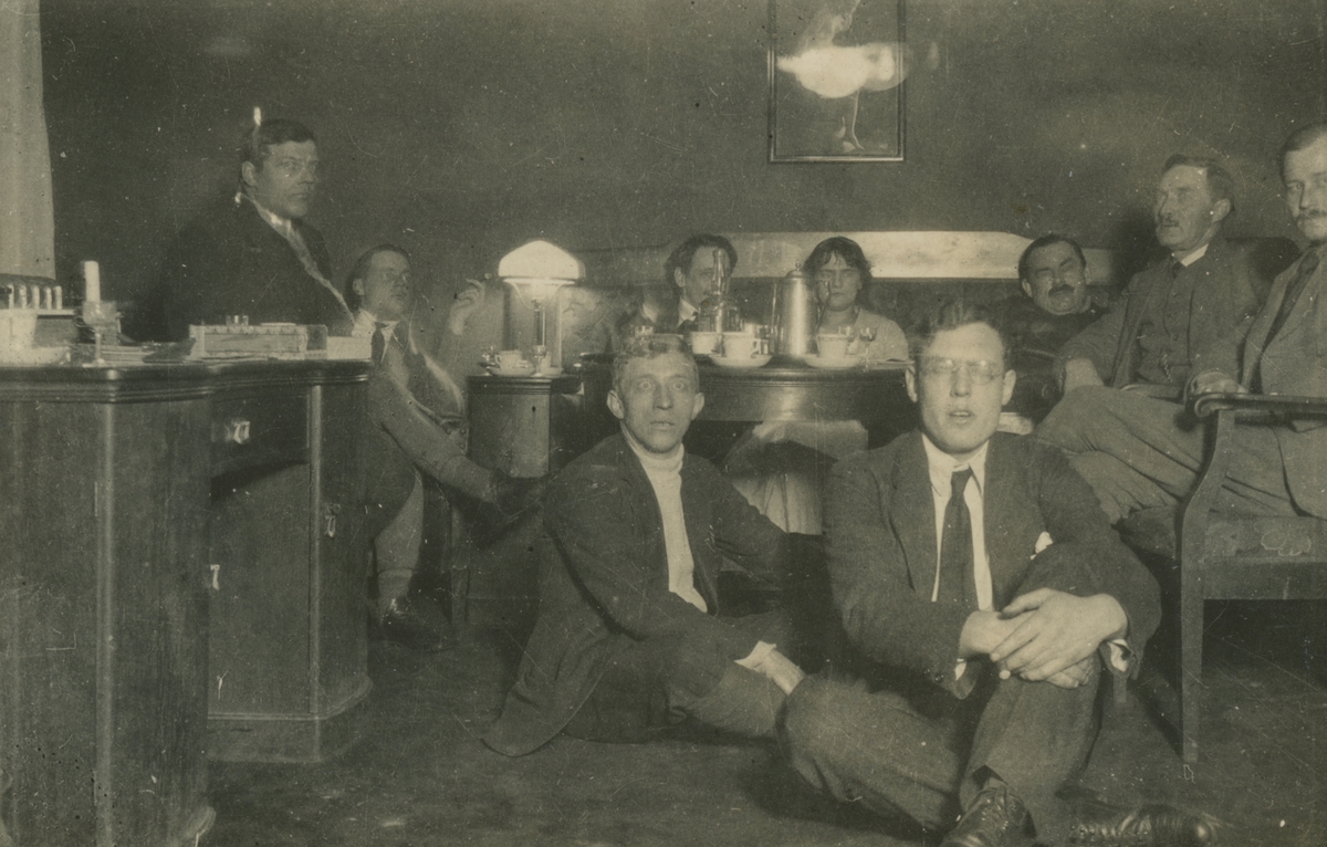Fotografi från expedition till Spetsbergen. Motiv av en grupp välklädda människor som dricker kaffe. Några sitter i en soffa, andra i fåtöljer och ett par på golvet. På fotografiet syns ett skrivbord och ett bord med kaffekanna och koppar.