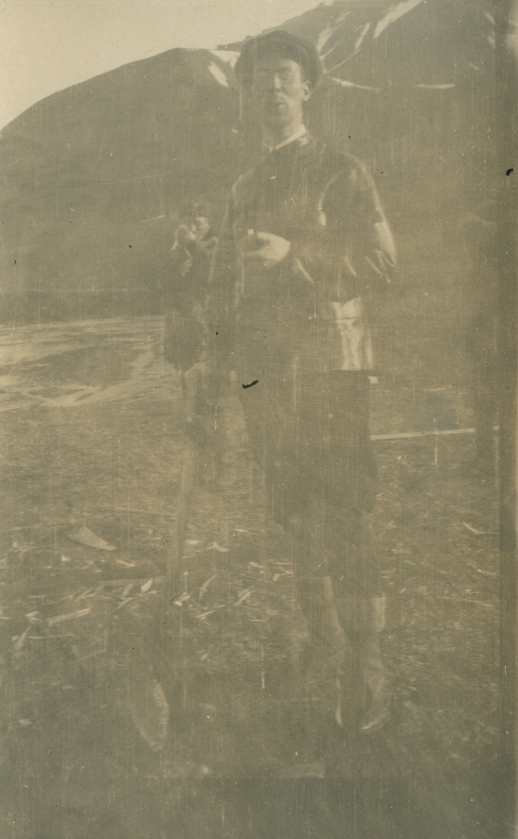 Fotografi från expedition till Spetsbergen. Motiv av två män stående i ett kargt bergslandskap.