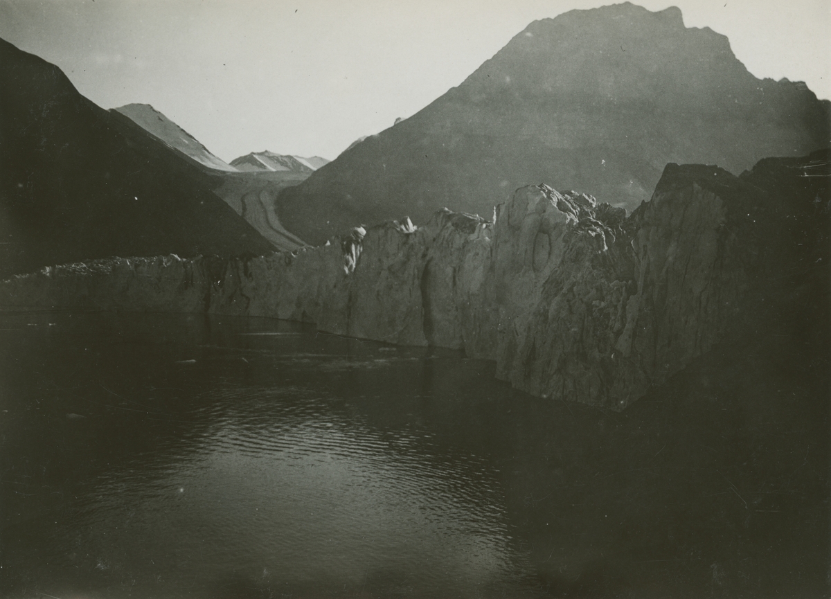 Fotografi från expedition till Östgrönland 1929. Dansk-svensk expedition under ledning av Lauge Koch. Svenska deltagare: Oscar Kulling och Helge Backlund. Vy över havsvik och bergslandskap.