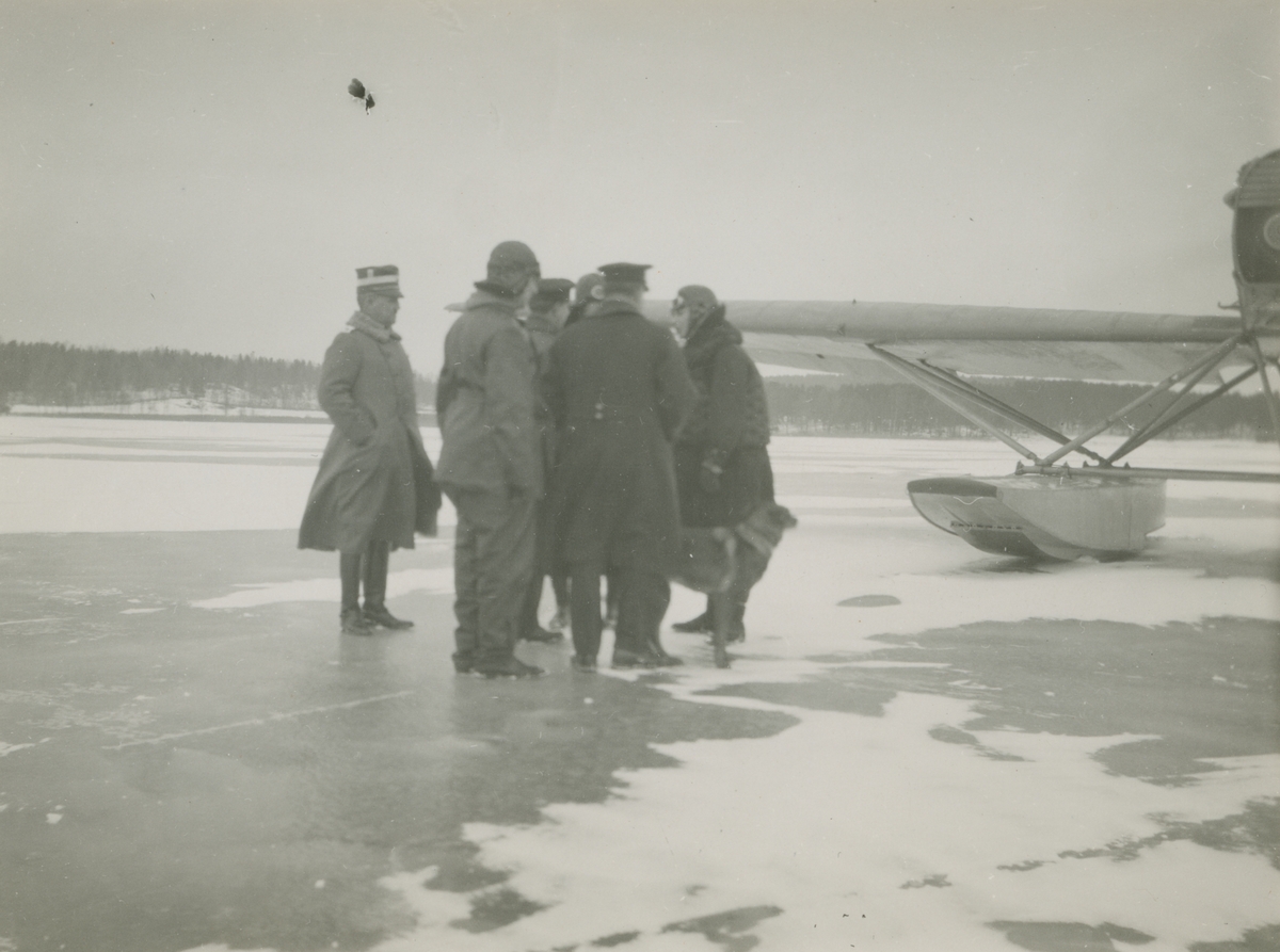 Diverse bilder från Fred Goldbergs samling. Motiv av en grupp människor som testar isflottör för flygbåt i Hägernäs 1926.