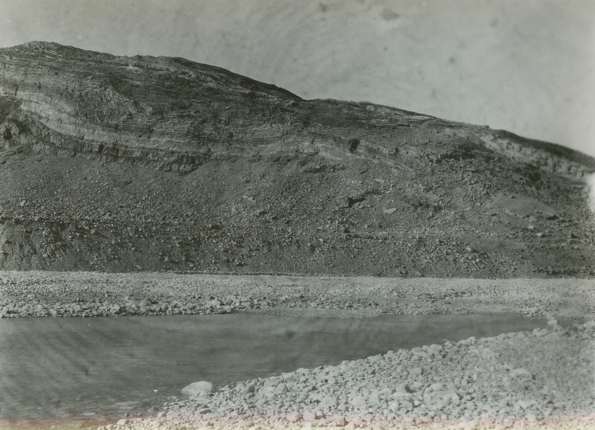 Fotografi från expedition till Östgrönland 1929. Dansk-svensk expedition under ledning av Lauge Koch. Svenska deltagare: Oscar Kulling och Helge Backlund. Motiv av stenigt bergslandskap och vatten.