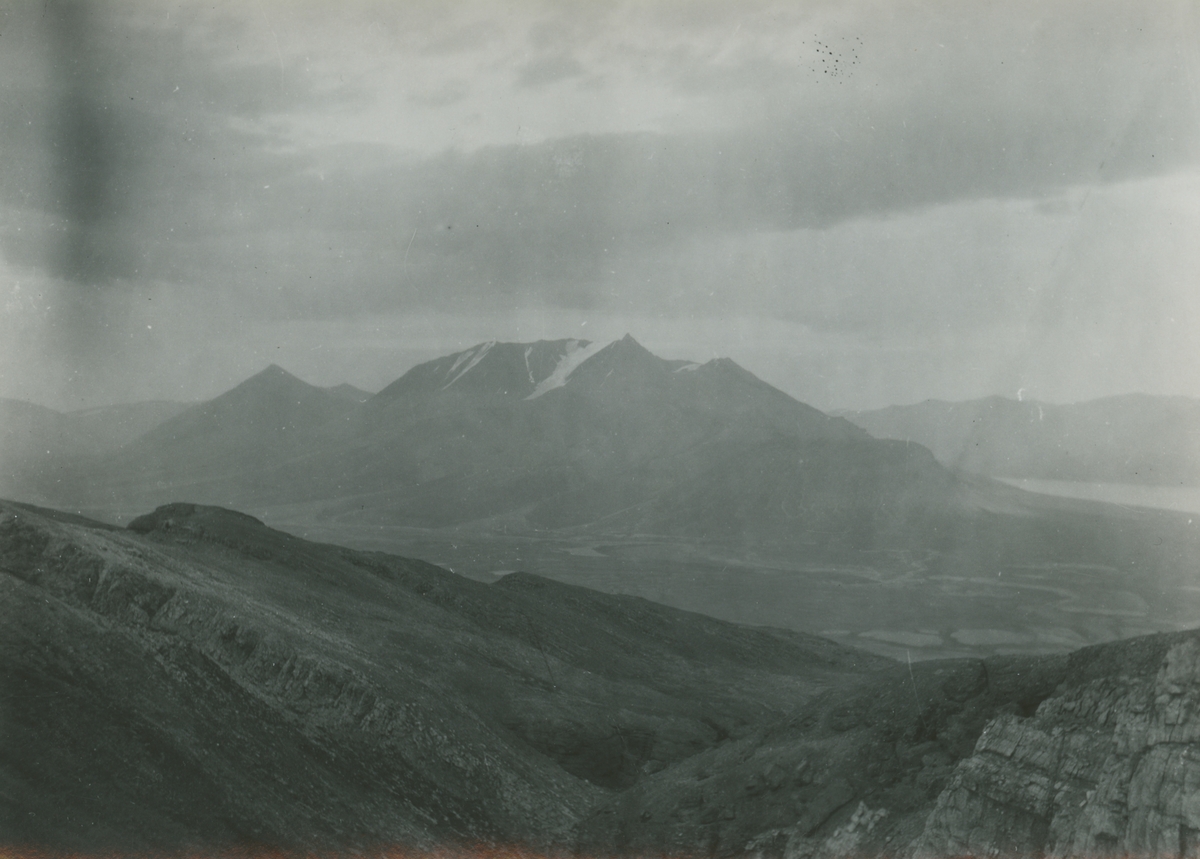 Fotografi från expedition till Östgrönland 1929. Dansk-svensk expedition under ledning av Lauge Koch. Svenska deltagare: Oscar Kulling och Helge Backlund. Vy över bergslandskap och himmel.