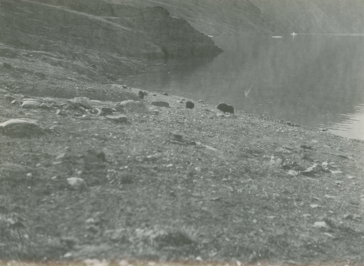 Fotografi från expedition till Östgrönland 1929. Dansk-svensk expedition under ledning av Lauge Koch. Svenska deltagare: Oscar Kulling och Helge Backlund. Motiv av stenig strand vid vatten i ett bergslandskap.