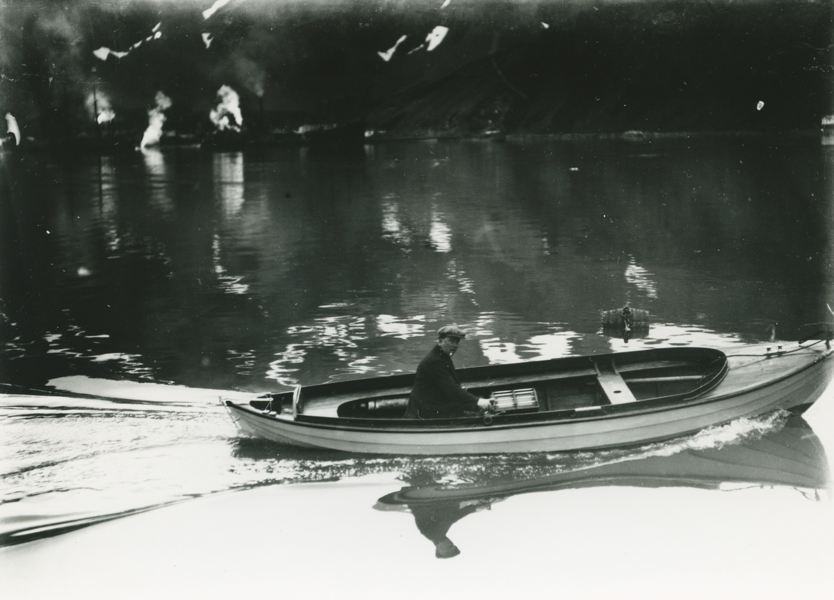 Bild från expedition i Antarktisområdet. Motiv av man i liten båt.