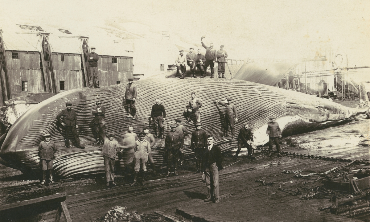 Bild från expedition i Antarktisområdet. Motiv av ett stort antal män vid fångad blåval, 1928.