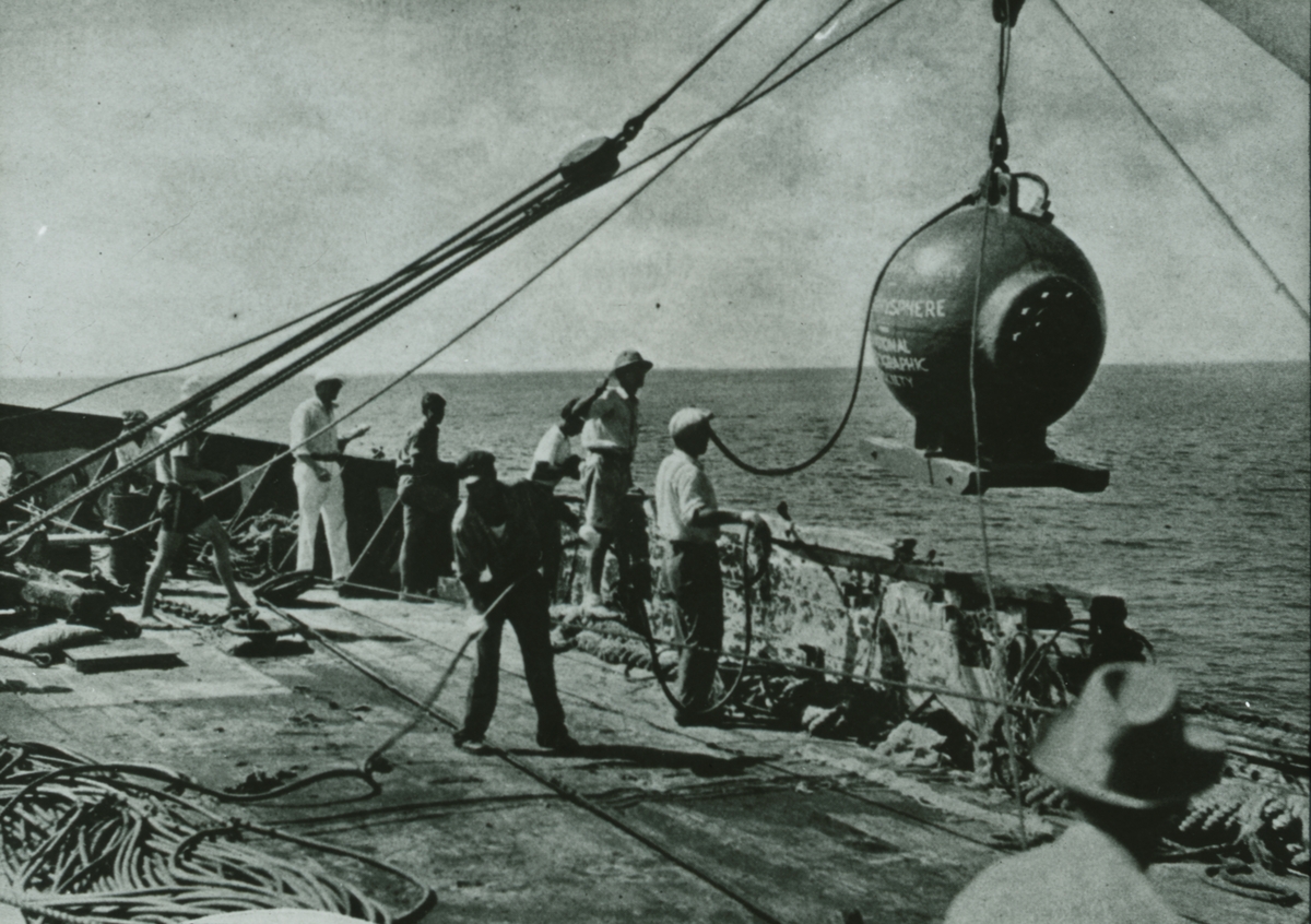 Glasnegativ med motiv av nedsänkning av dykarklocka i havet.