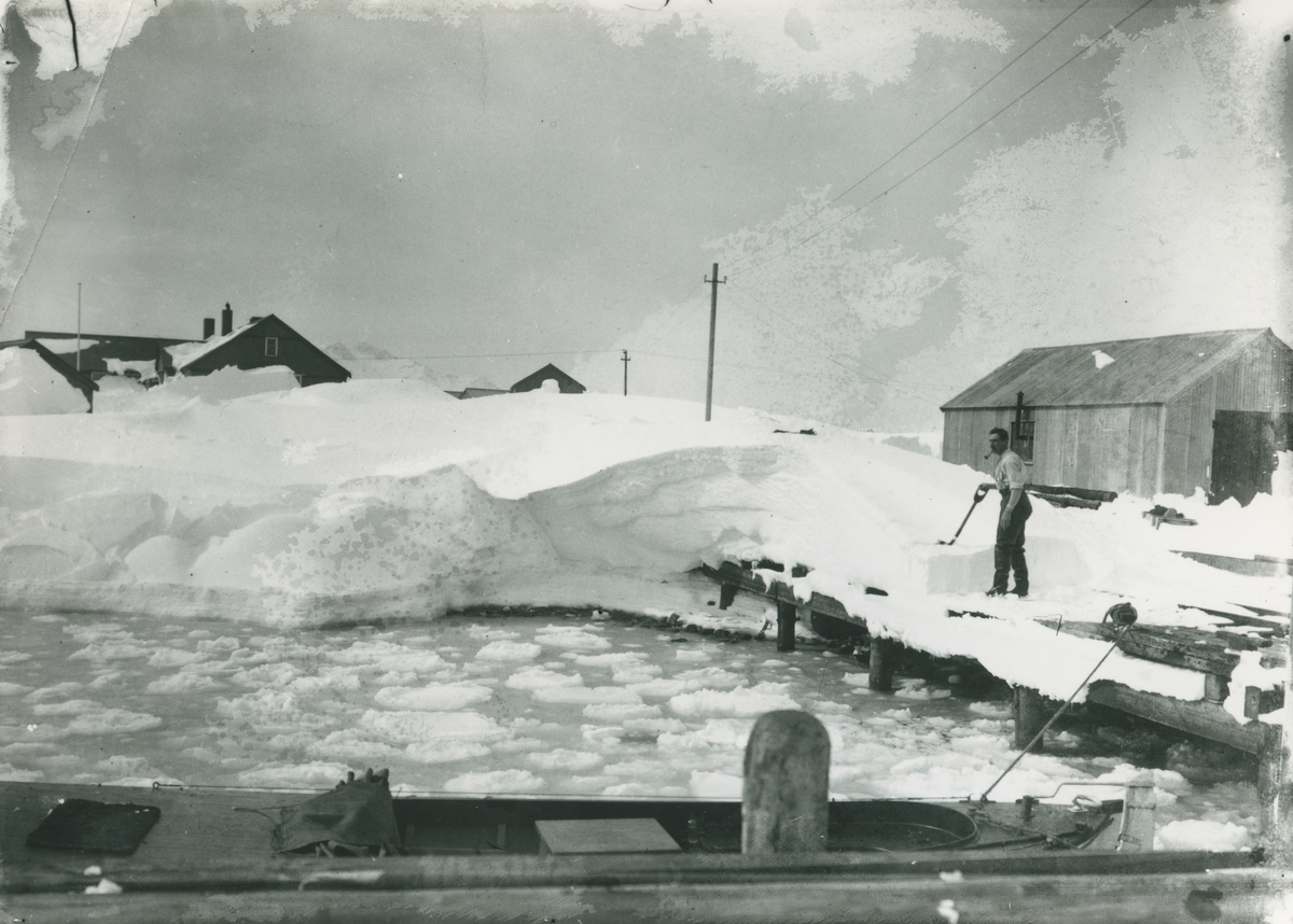 Bild från expedition i Antarktisområdet. Motiv av man som skyfflar snö vid hamn i Sydgeorgien.