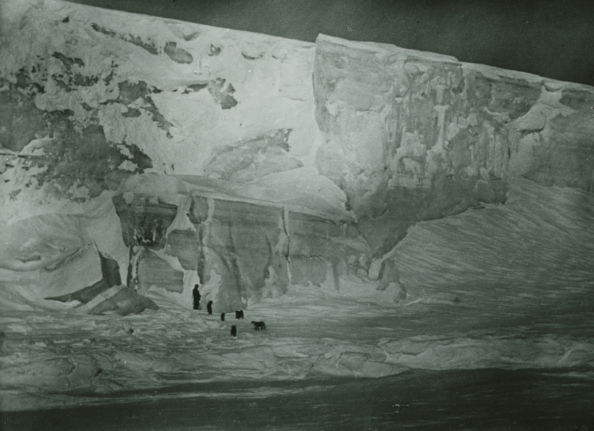 Fotografi från Grönland. Motiv av man och hundspann nedanför isberg.