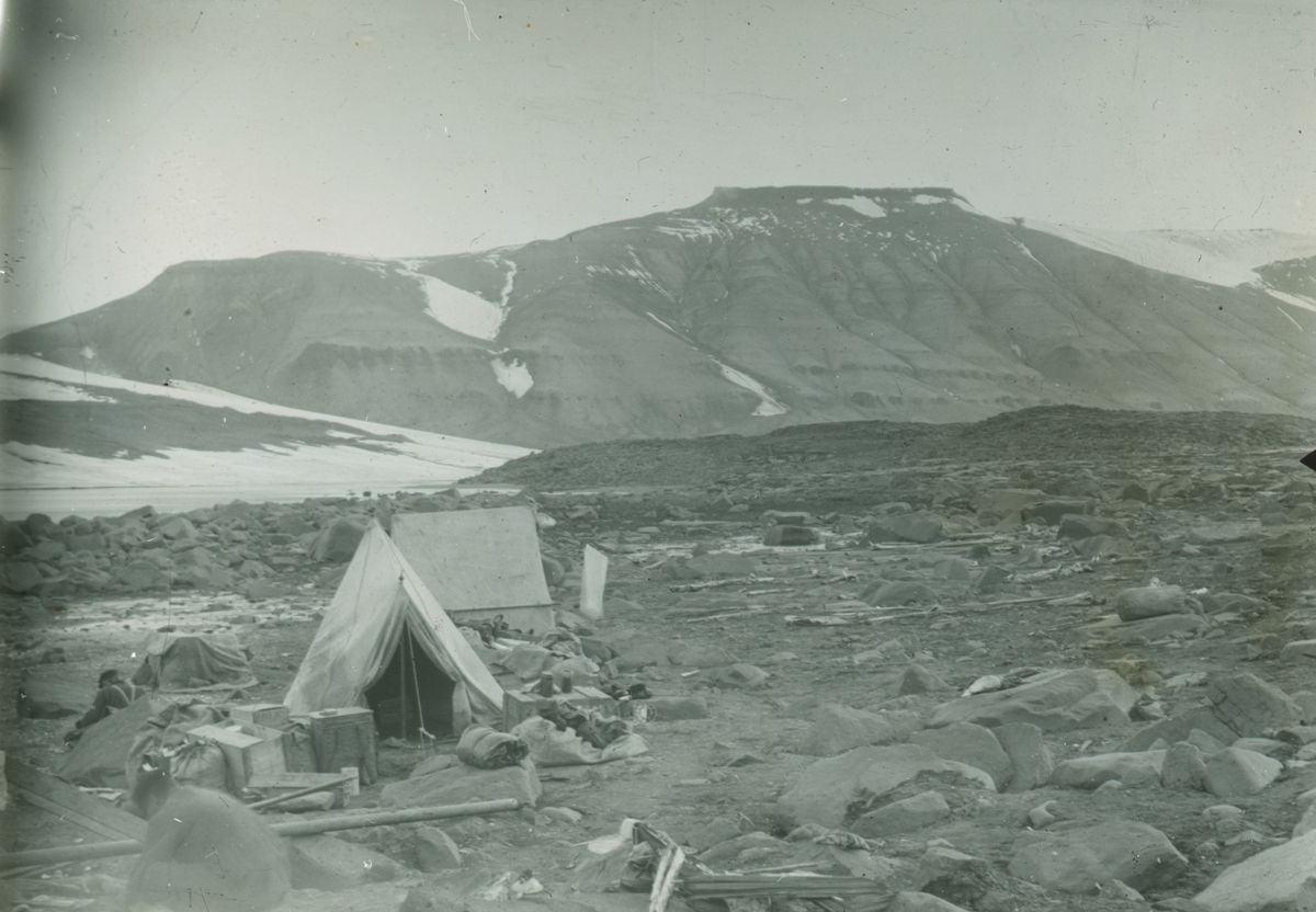 Fotografi från expedition till Spetsbergen. Motiv av tält i ett bergslandskap.