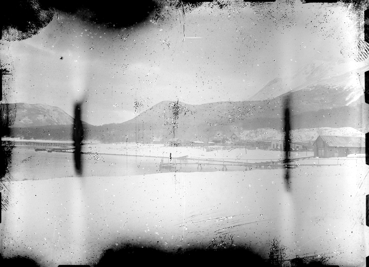 Fotografi från Eldslandet. Motiv av liten hamn nedanför berg.