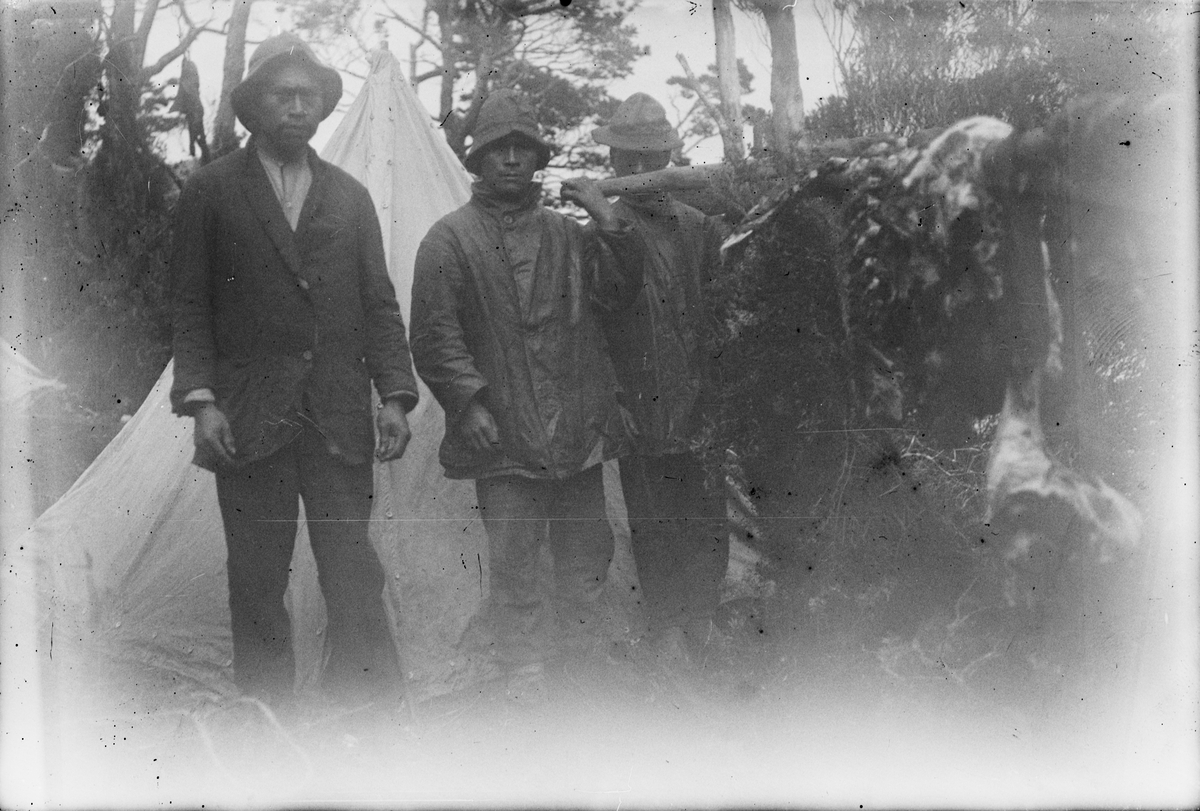 Fotografi från Eldslandet. Motiv av tre män framför tält i djungeln.