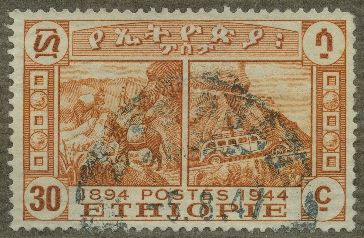 Frimärke från Etiopien, 1947. Motiv av Etiopisk postbefordran Förr- 1894: per mulor Nu-1944: per postbuss -50-årsminne: etiopisk post: 1894-1944.