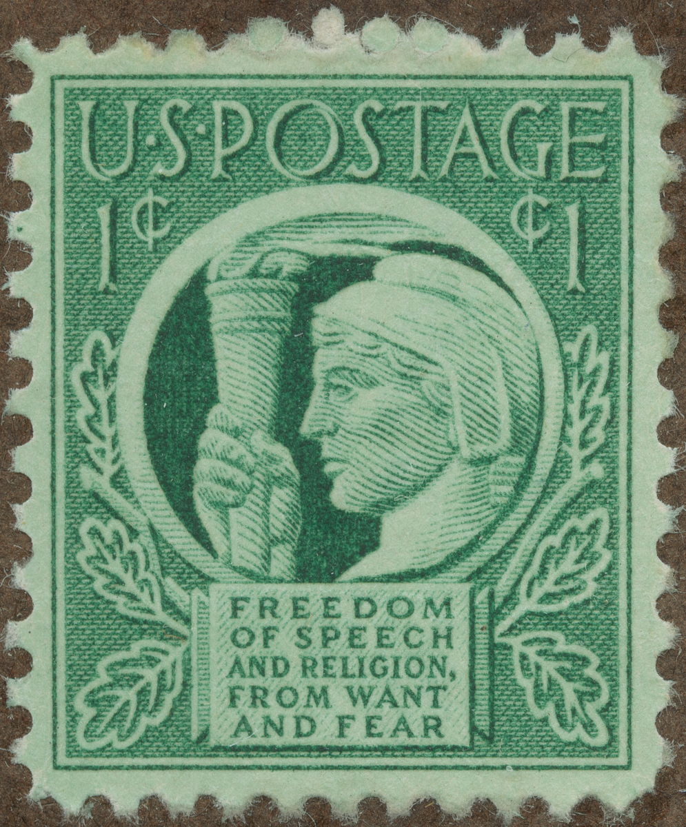 Frimärke från U.S.A., 1944. Motiv av Symbol för Ordets och religionens frihet: skydd mot nöd och frygt. ("Freedom of speech and religion, from want and fear".)
