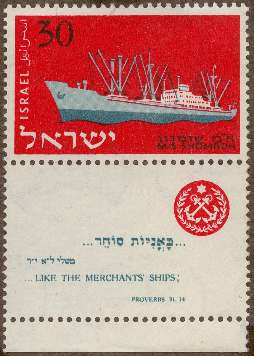 Frimärke från Israel, 1957. Motiv av Fraktfartyg Shomron Ordspråksboken 31:14 "Serie: Israels Handelsflotta."