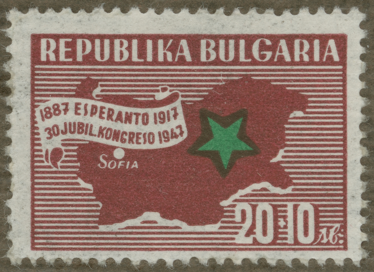 Frimärke från Bulgarien, 1947. Karta över Bulgarien. "30-nde Esperanto kongress i Sofia 1947".