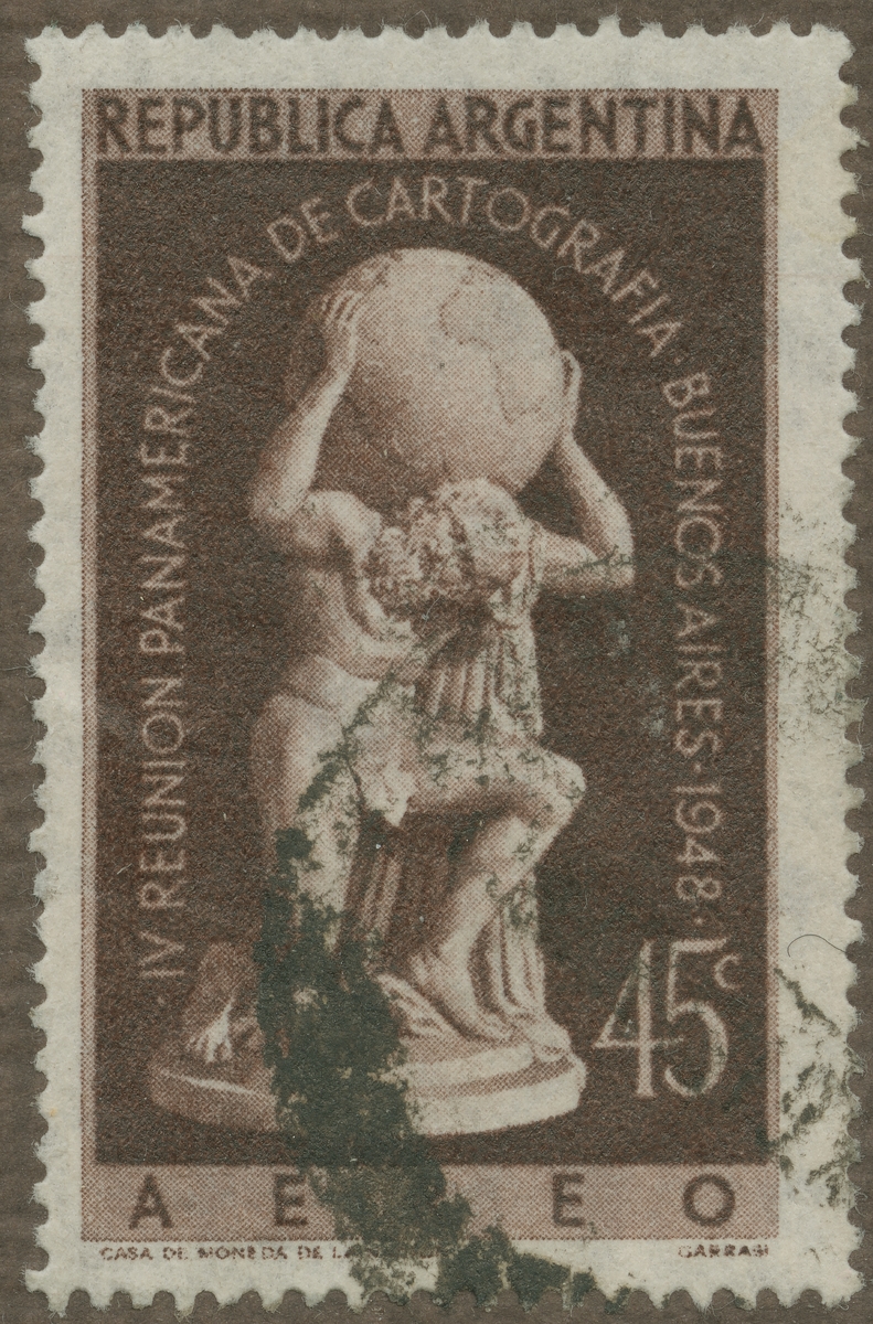 Frimärke från Argentina, 1948. Motiv av Atlas bärande jordglob. "4. Panamerikanska kongressen i Buenos Aires 1948: Geograf kongress".