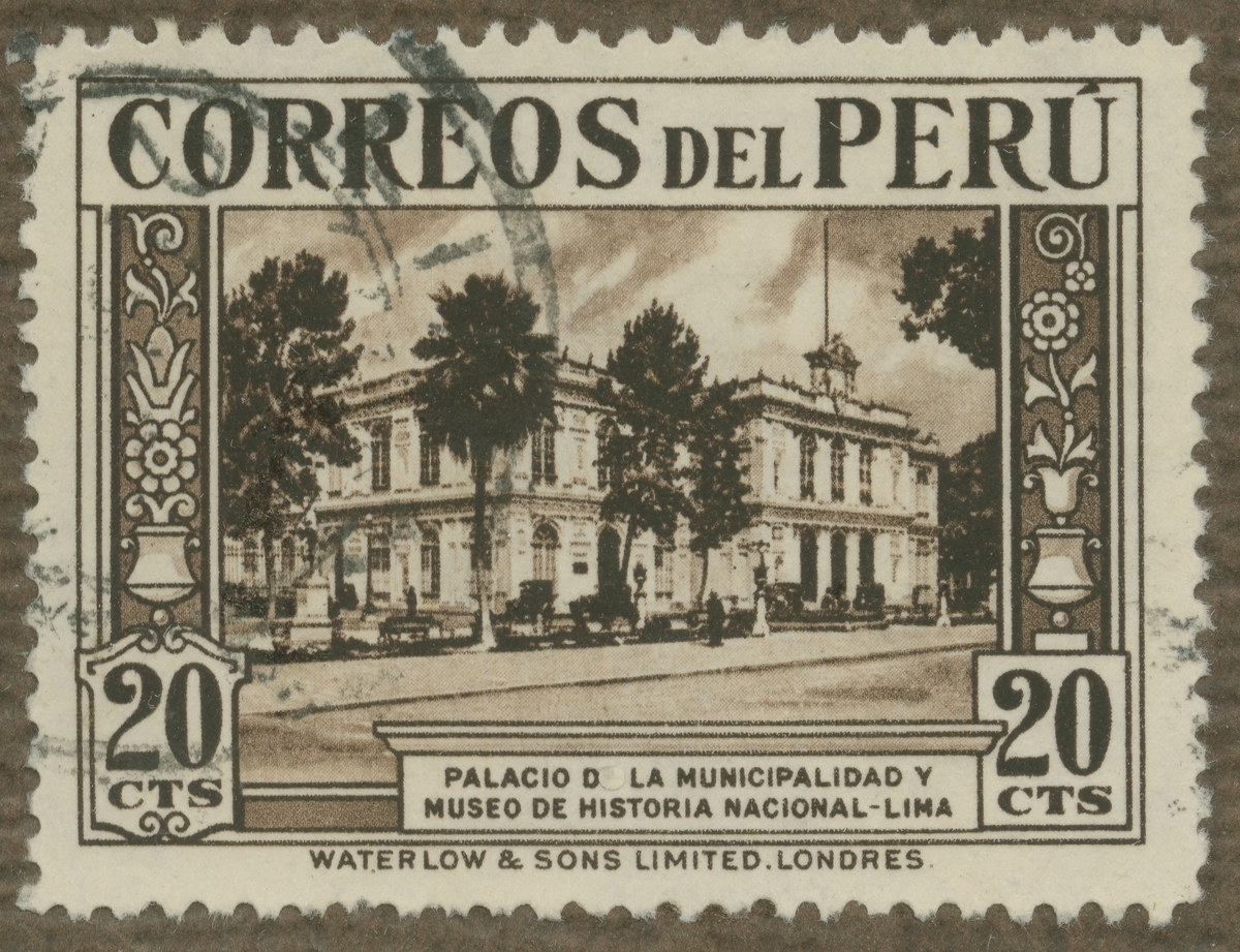 Frimärke från Peru, 1936. Motiv av Stadshuset och Nationalmuseet i Lima.