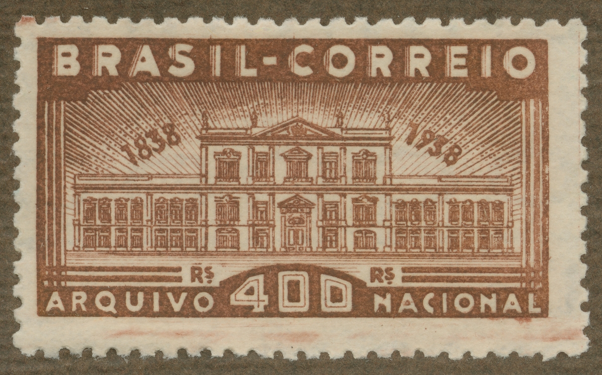 Frimärke från Brasilien, 1938. Motiv av Nationalarkivet i Brasilien. "100-årsminne 1838-1938".