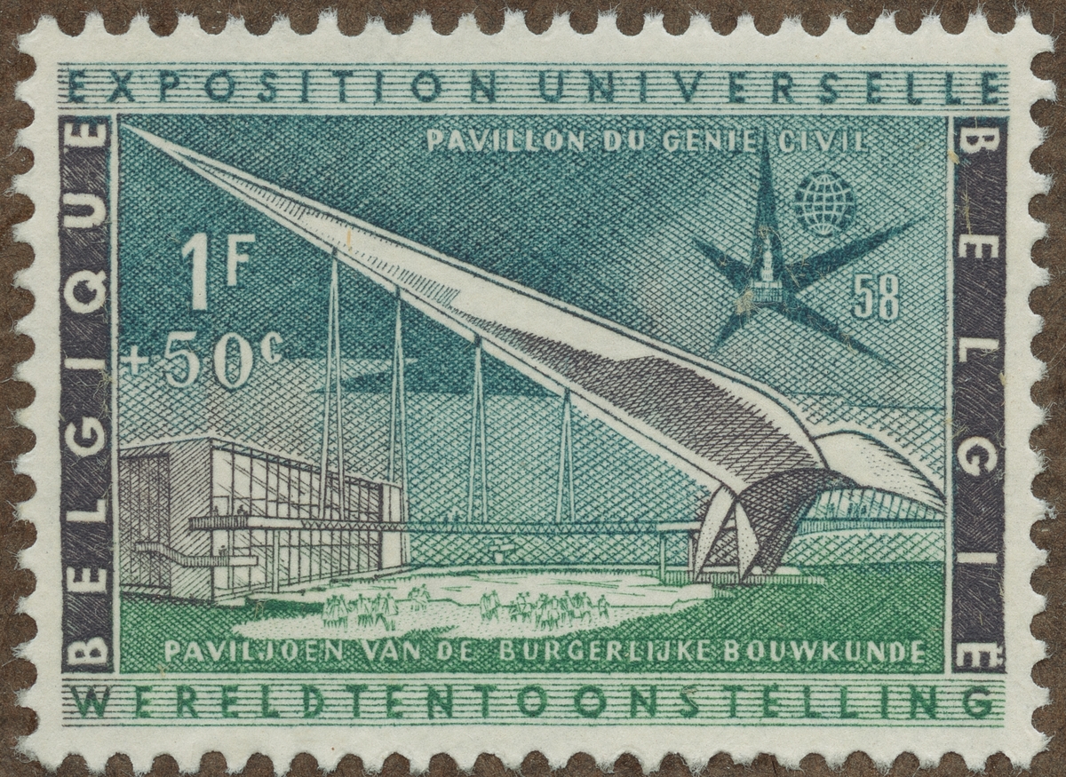 Frimärke från Belgien, 1958. Motiv av Utställningen i Brüssel 1958 Betongbyggnad