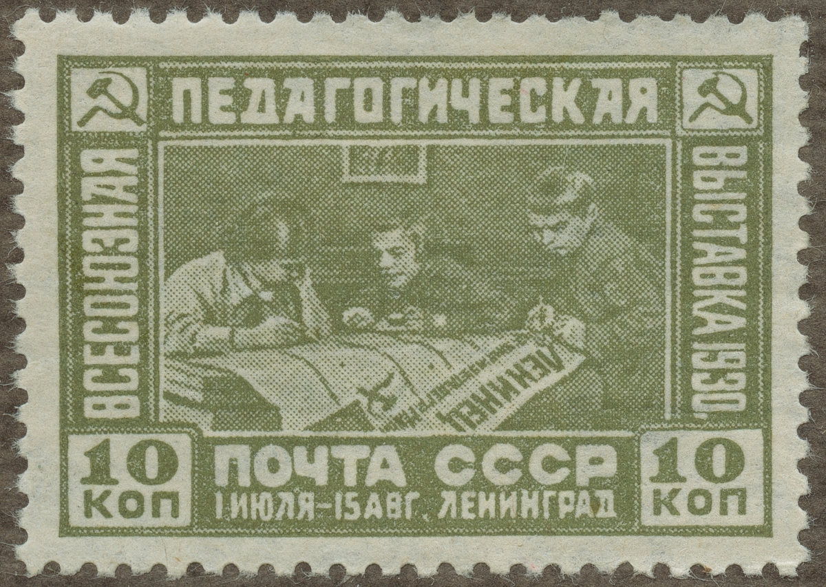 Frimärke från Ryssland, 1930. Motiv av Första pedagogutställningen i Leningrad -Ryska skolbarn redigerar tidningen "Leninist"-