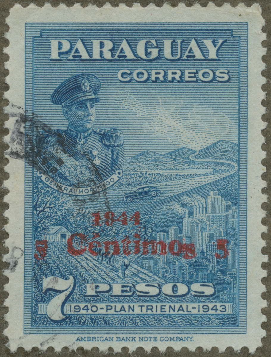 Frimärke ur Gösta Bodmans filatelistiska motivsamling, påbörjad 1950. Frimärke från Paraguay, 1943. Motiv av "Fabriksväsen, Jordbruk, Samfärdsel Tre-årsplan 1940-43"