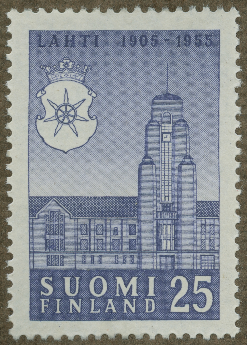 Frimärke från Finland, 1955. Motiv av momumentalbyggnad i Lahti 1905-1955. "50-årsminne".